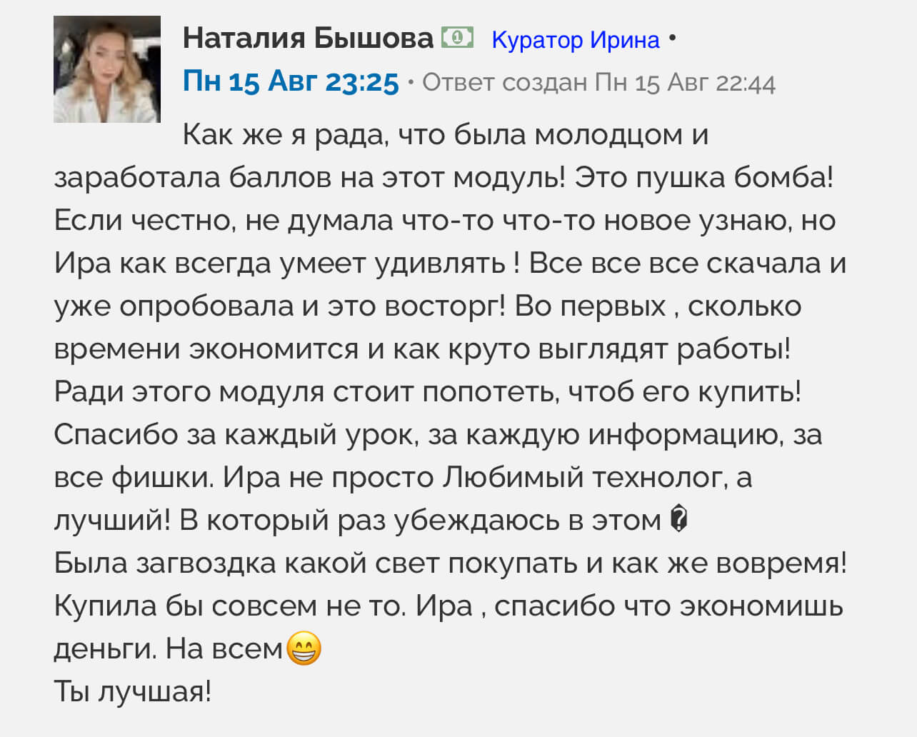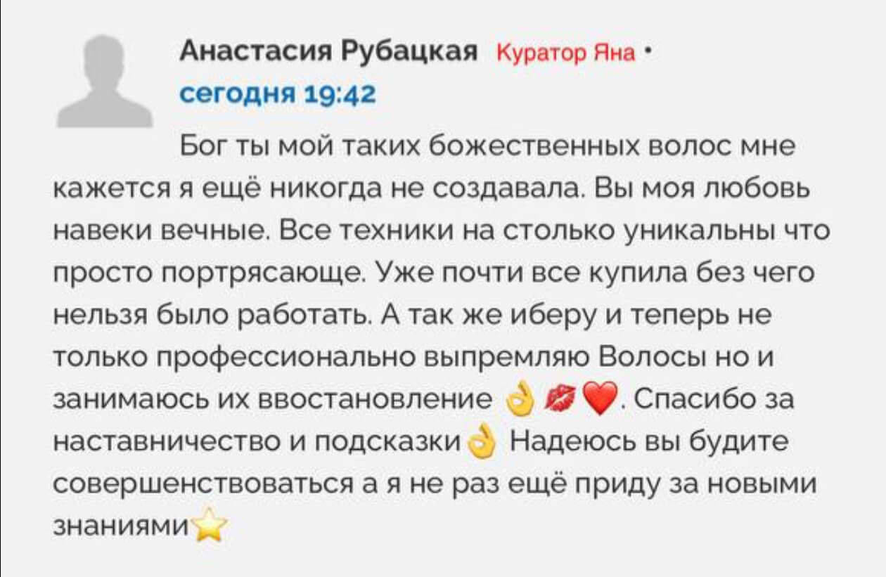 На этом модуле ты получишь инструменты по ускорению своей работы в 2-3 раза. Поймешь, как сделать волосы полностью без елок - тебя больше никогда это не будет пугать. Тебе будут завидовать технологи. И наконец-то ты перестанешь сомневаться - выпарила, недовыпарила, перевыпарила. Перестанешь боятся высоких температур, что недопарила, спалила или невыпрямила волосы. Наконец-то ты со спокойной душой будешь смывать состав с волос.